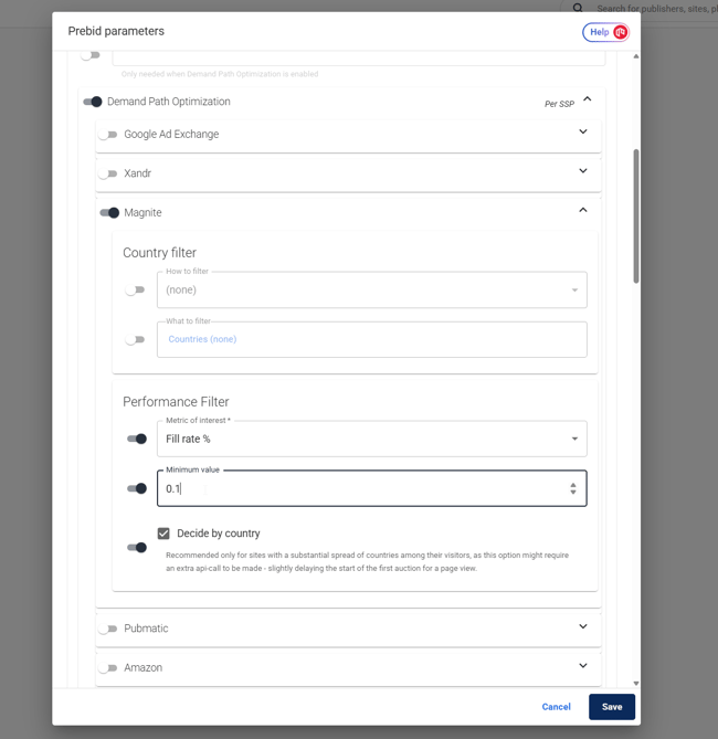 You can choose to trigger this functionality for each SSP, based on Fill Rate and Ad Unit eCPM, and it can also be configured to check per country if preferred: