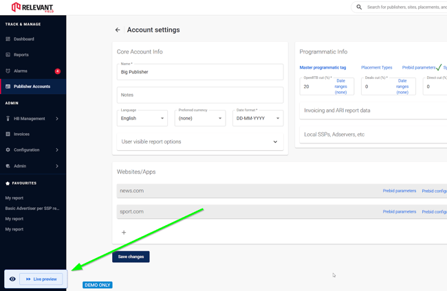 The LivePreview option is available on pages where you would normally make changes to the Prebid parameters, including Global, Publisher, Website, and Placement levels.