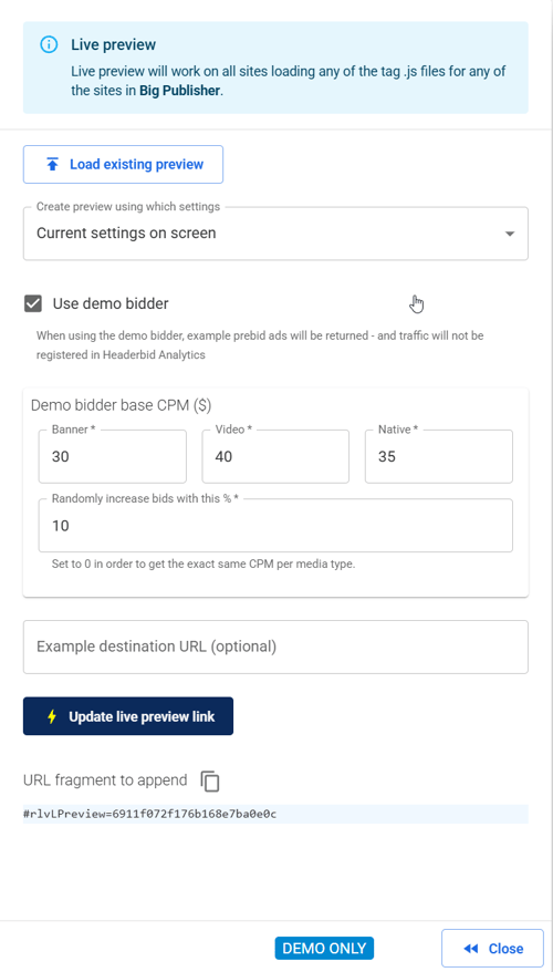 The LivePreview offers several options. You can use a demo bidder with selected base CPMs that does not log data in HB Analytics, allowing you to test bids without recording them: